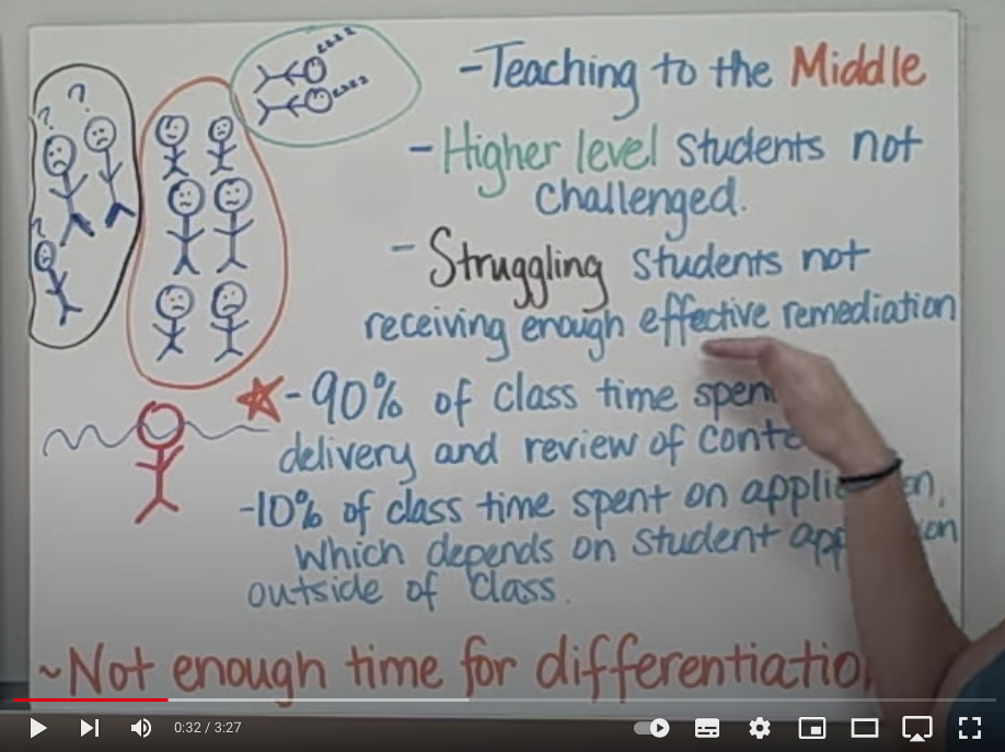 ..to a model where the students consume the content in their own time and then her classroom is designed for her to support all ranges of students working on applying the content that they are currently trying to learn. Advanced students work ahead a little, struggling students are given more support, and the middle students even benefit from having the teacher there when carrying out what used to be “homework” activities.