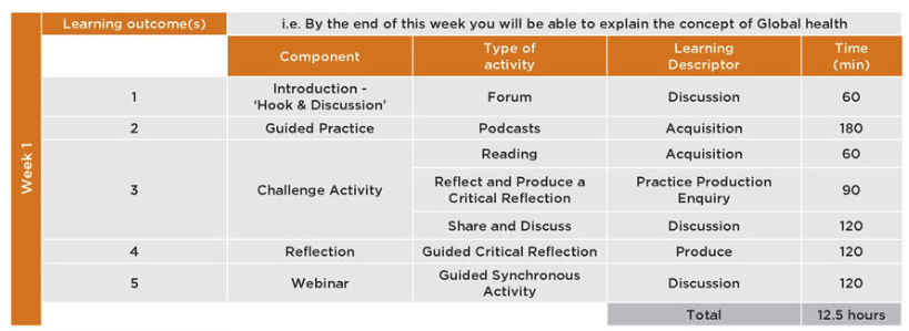 | 1 | Introduction ‘Hook & Discussion’ | The Introduction section helps students activate prior knowledge / experience they may already have on the topic. This is also an opportunity to relate the weekly topic to the students’ personal experience or current practice. |